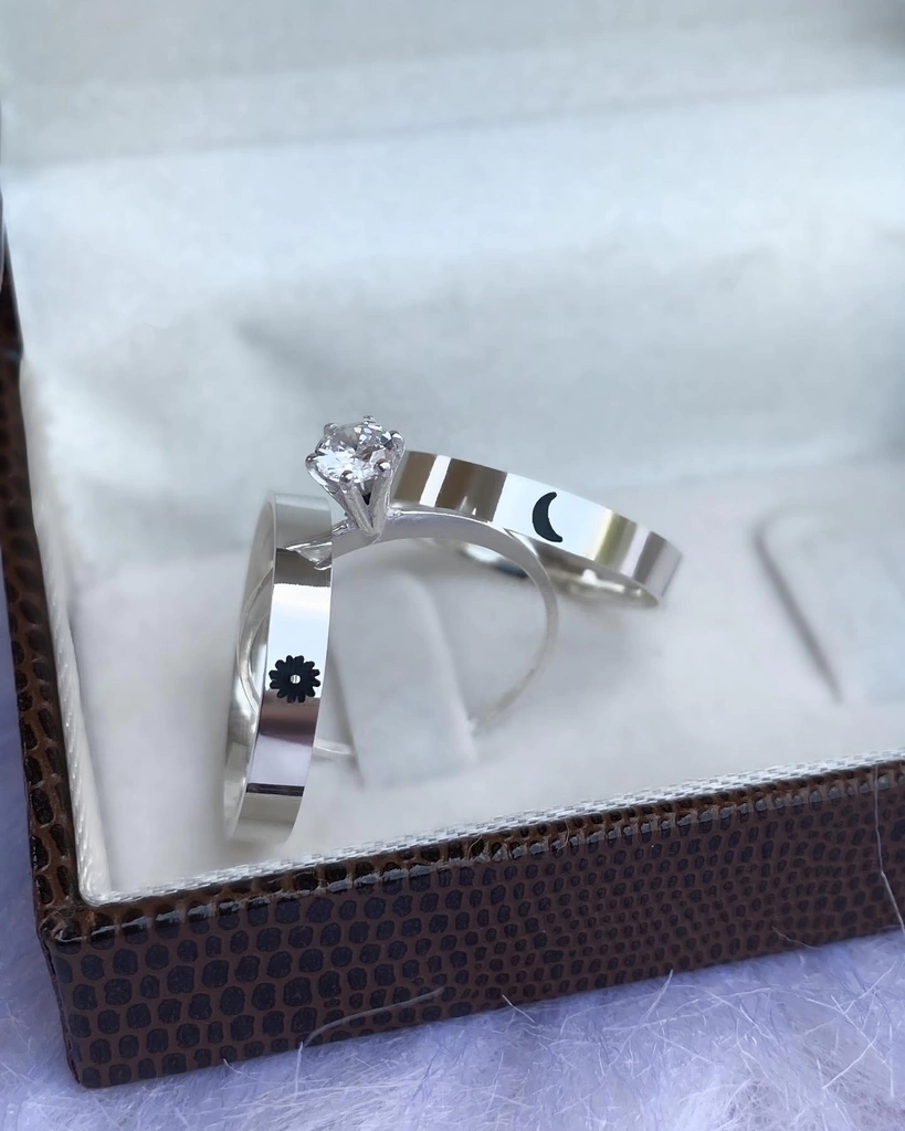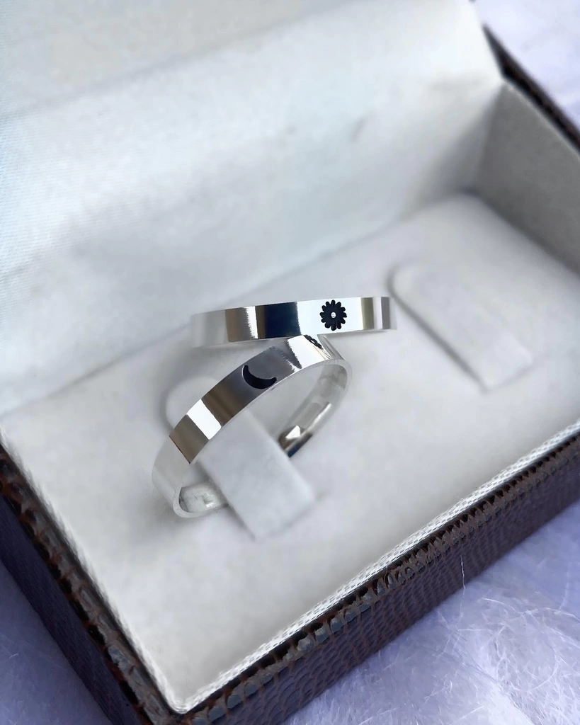 PAR DE ALIANÇAS DE NAMORO PRATA 950 | Modelo Sol e Lua